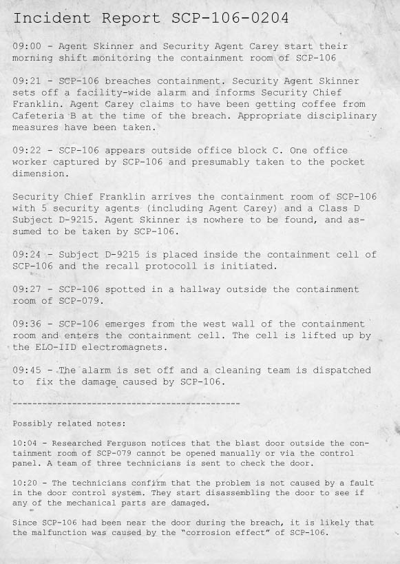 A document detailing a breach by SCP-106 prior to the events of the game.