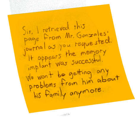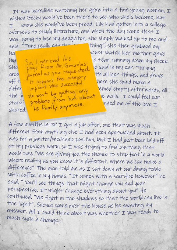 "It was incredible watching her grow into a fine young woman, I wished Becky would’ve been there to see who she’s become, but I know she would’ve been proud. Lily had gotten into a college oversees to study literature, and when the day came that I was going to lose my daughter, she simply walked up to me and said “Time really can change anything”, she then grabbed my hand, opened it up, and put the pocket watch her mother gave her into my hand. I looked at her, a tear running down my cheek. She hugged me, “I love you dad” she said in my ear. Turning around she got in her car packed with all her things, and drove off to a new phase of her life, one where she could make a difference in the world. The house seemed empty afterwards, all the intimate memories sealed into the walls. I could feel our story in that house, and it always reminded me of the love I shared. A few months later I got a job offer, one that was much different from anything else I had been approached about. It was for a janitor/mechanic position, but I had just been laid off at my previous work, so I was trying to find anything that would pay. “We are giving you the chance to step foot in a world where reality as you know it is different. Where we can make a difference” The man told me as I sat down at our dining table with coffee in my hands. “It comes with a sacrifice however” he said, “ You’ll see things that might change you and your perspective. It might change everything about you” He continued. “We fight in the shadows so that the world can live in the light”. Silence came over the house as he awaiting my answer. All I could think about was whether I was ready to much such a change.." The sticky note reads: Located in Dr. Harp's Office. |