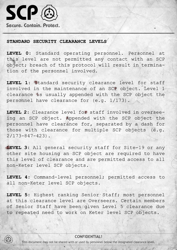A document describing all of the clearance level limitations and accesses. Each letter that's marked with blood spells out the word "Spiral".