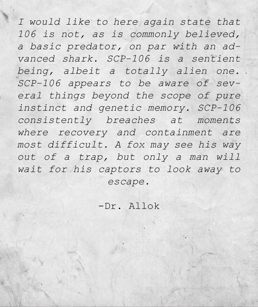 A document signed by Dr. Allok as a notice to all staff that SCP-106 is, indeed, a type of sapient being. The text was borrowed from the Tale "Treats" on the SCP Wiki.