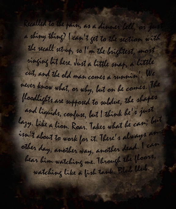 "Recalled to the pain, as a dinner bell, or just a shiny thing? I can't get to the section with the recall set-up, so I'm the brightest, most ringing bit here. Just a little snap, a little cut, and the old man comes a runnin'. We never know what, or why, but on he comes, The floodlights are supposed to subdue, the shapes and liquids, confuse, but I think he's just lazy. Like a lion. Roar. Takes what he can, but isn't about to work for it. There's always another day, another way, another dead. I can hear him watching me. Through the floors, watching like a fish tank. Blub blub." |