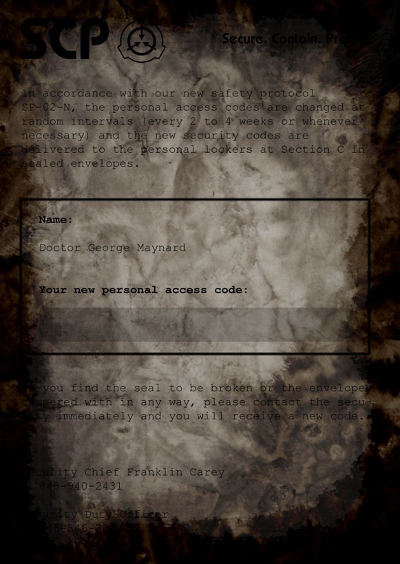 A document which has been corroded by SCP-106. It shows the access code to Dr. Maynard's office. Said code is randomized and only appears in-game.