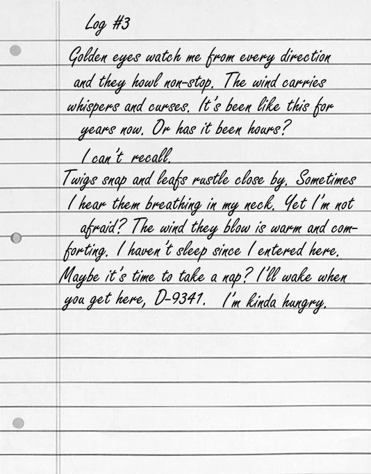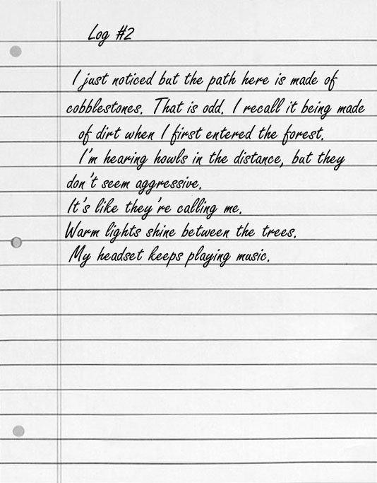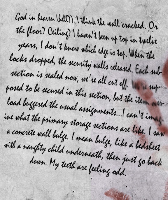 "I don't know why I'm bothering. I'm the only one alive anymore, I think. Or maybe just sane? Or am I even that much, at this point? I feel like I have to leave something, some shard of myself behind. I've seen the others, I know I'll most likely not even leave a body. So maybe that's what this is. Slivering myself off, leaving breadcrumbs of my brain, scattered and tattered. I keep hearing things in the dark. It's almost worse than what's in the light. I taste metal. Dr. L" |