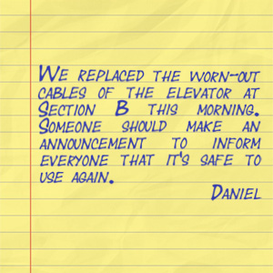 A note left by Technician Daniel saying that the elevator in Sector B is now safe to use again. It is also a reference to Daniel and the sequence involving the elevator from the game Amnesia: The Dark Descent.