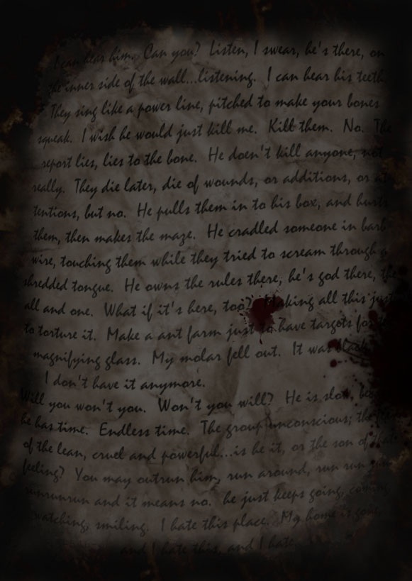 "I can hear him. Can you? Listen, I swear, he's there, on the inner side of the wall...listening. I can hear his teeth. They sing like a power line, pitched to make your bones squeak. I wish he would just kill me. Kill them. No. The report lies, lies to the bone. He doesn't kill anyone, not really. They die later, die of wounds, or additions, or attentions, but no. He pulls them in to his box, and hurts them, then makes the maze. He cradled someone in barb wire, touching them while they tried to scream through a shredded tongue. He owns the rules there, he's god there, the all and one. What if it's here, too? Making all this just to torture it. Make a ant farm just to have targets for the magnifying glass. My molar fell out. It was black. I don't have it anymore. Will you won't you. Won't you will? He is slow, because he has time. Endless time. The group unconscious, the fear of the lean, cruel and powerful...is he it, or the son of that feeling? You may outrun him, run around, run run runrunrunrun and it means no. he just keeps going, coming, watching, smiling. I hate this place. My home is gone, and I hate this, and I hate." Located beside the elevator to the Maintenance Tunnels. |