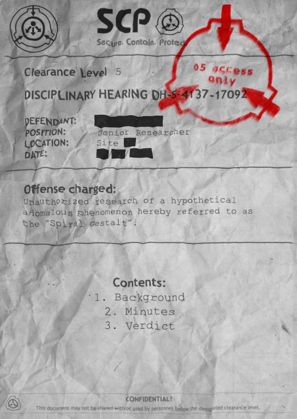 A disciplinary hearing directed towards D-9341 due to having done unauthorized research on an anomalous phenomena dubbed "Spiral Gestalt". This document, combined with the fact that it supposedly has nostalgic importance to D-9341, hints at the idea that he may have been an SCP Foundation employee before becoming a Class-D. The document itself is crumpled and includes a stamp reading: "O5 access only" "CLEARANCE LEVEL 5 DISCIPLINARY HEARING DH-S-4137-17092 DEFENDANT: ████████████ Offense charged: 1. Background Located in SCP-1162. |