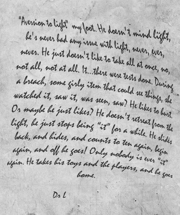 ""Aversion to light" my foot. He doesn't mind light, he's never had any issue with light, never, ever, never. He just doesn't like to take all at once, no, not all, not at all. It...there were tests done. During a breach, some girly item that could see things, she watched it, saw it, was seen, saw? He likes to hunt. Or maybe he just likes? He doesn't retreat from the light, he just stops being "it" for a while. He slides back, and hides, and counts to ten again, begin again, and off he goes! Only nobody is ever "it" again. He takes his toys and the players, and he goes home. Dr. L" |
