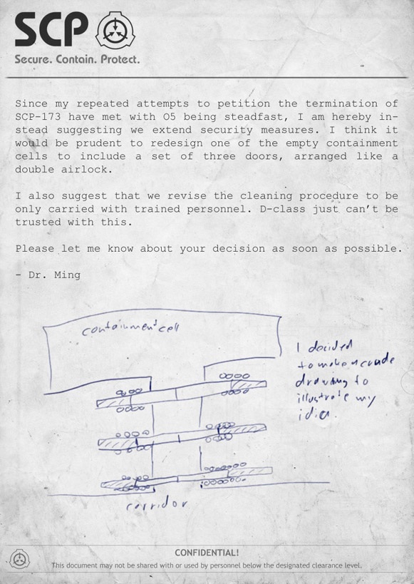 A note from Dr. Ming proposing to the O5 Command to extend security protocol if SCP-173 ever breaches containment.