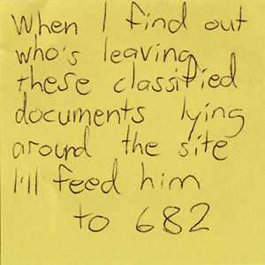 Humorous note threatning somebody leaving documents around the facility. Located in 2-Level Office. |