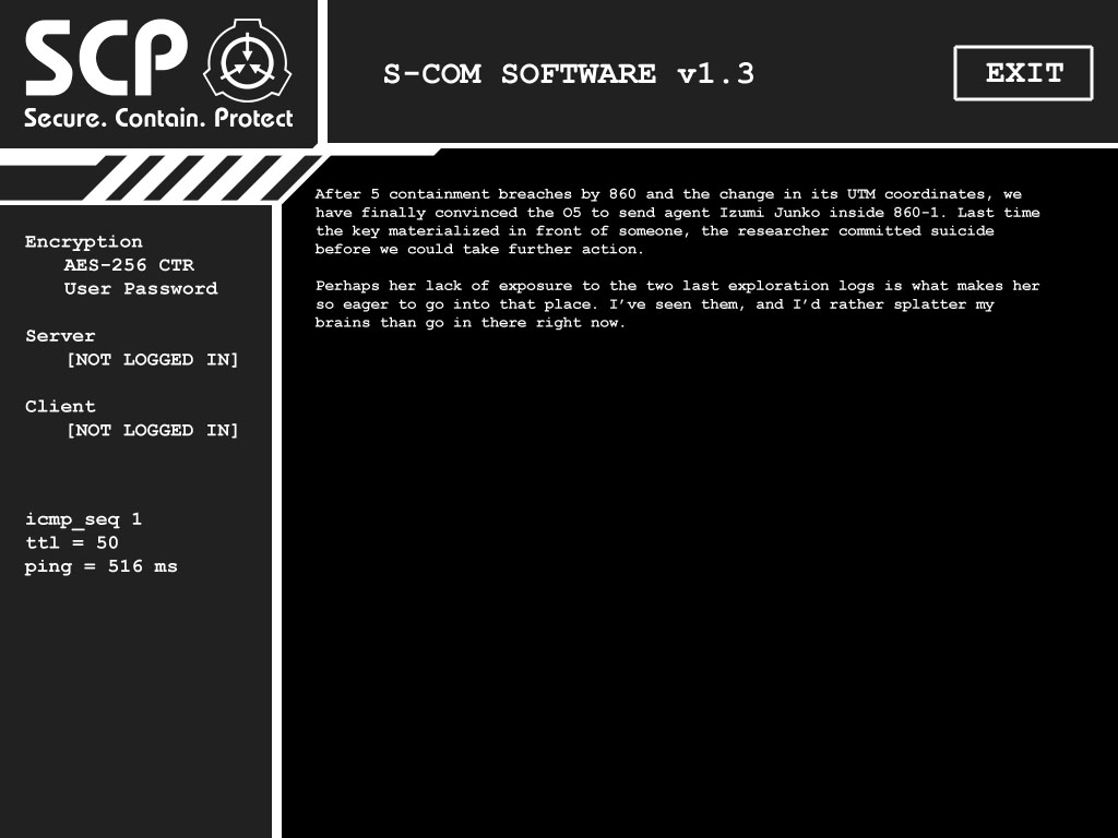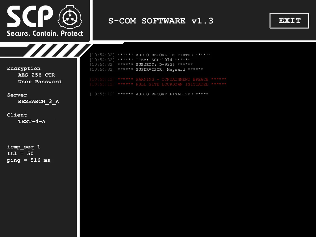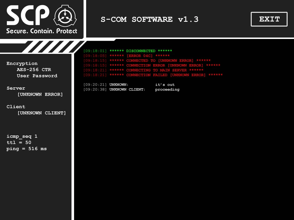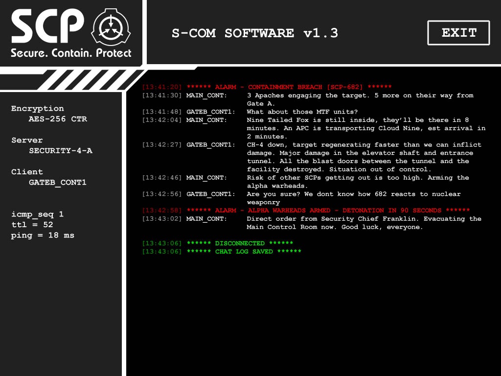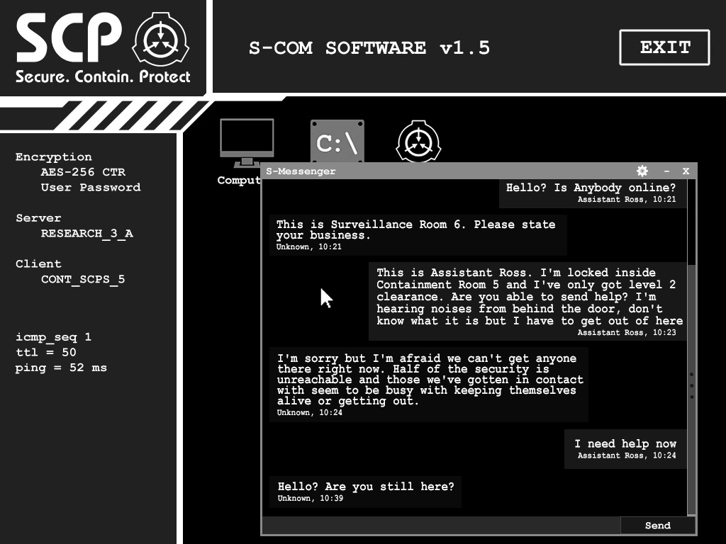 A monitor revealing that someone had sent a message saying "it's out" to Dr. Maynard, to which he replied that he was "proceeding" with an unspecified task. In actuality it is Agent Skinner telling Dr. Maynard that SCP-106 has been released from containment and that he should proceed with the task of giving SCP-079 access to all of the site's major systems. This is backed up by the fact that the time of the message being sent matches up with the time of SCP-106's first breach.