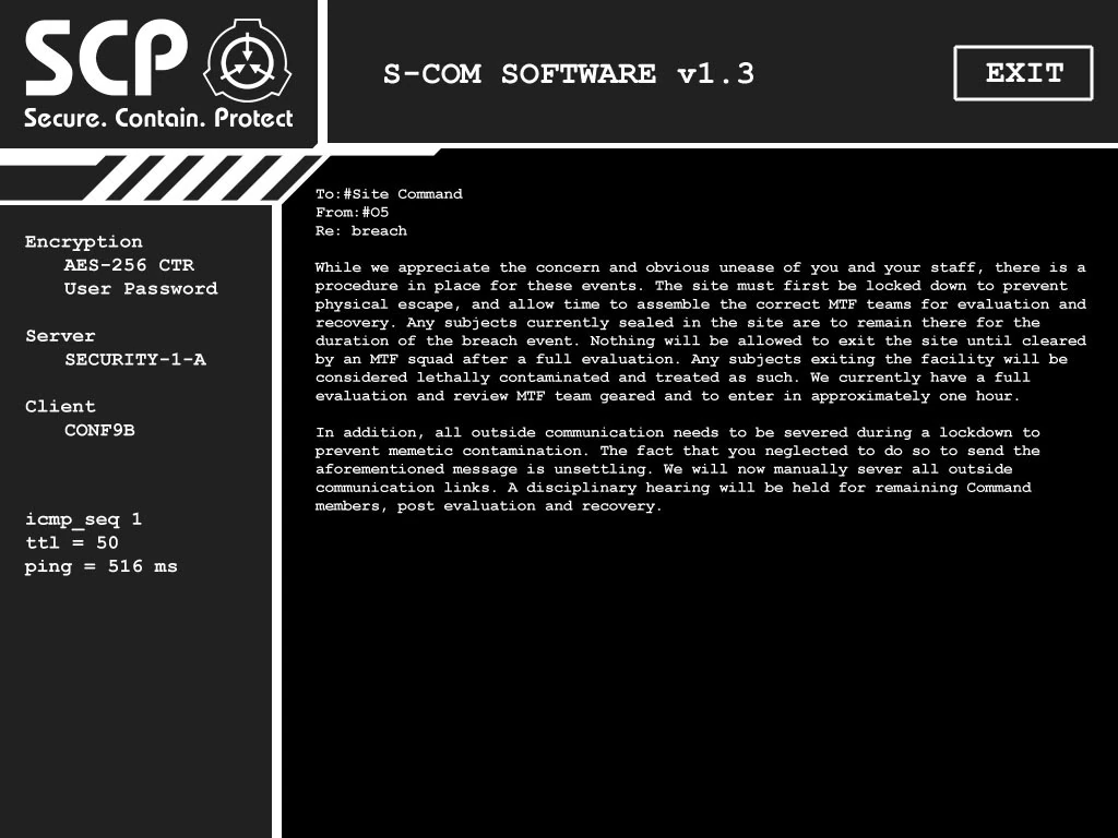 Located in the Conference Quarters. "To:#Site Command From:#O5 Re: breach While we appreciate the concern and obvious unease of you and your staff, there is a procedure in place for these events. The site must first be locked down to prevent physical escape, and allow time to assemble the correct MTF teams for evaluation and recovery. Any subjects currently sealed in the site are to remain there for the duration of the breach event. Nothing will be allowed to exit the site until cleared by a MTF squad after a full evaluation. Any subjects exiting the facility will be considered lethally contaminated and treated as such. We currently have a full evaluation and review MTF team geared and ready to start the evaluation within 72 hours. In addition, all outside communication needs to be severed during a lockdown to prevent memetic contamination. The fact that you neglected to do so to send the aforementioned message is unsettling. We will now manually sever all outside communication links. A disciplinary hearing will be held for remaining Command members, post evaluation and recovery." |