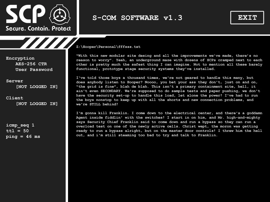 Located in the Electrical Center. Z:\Hooper\Personal\fffsss.txt ""With this new modular site desing and all the improvements we've made, there's no reason to worry". Yeah, an underground maze with dozens of SCPs cramped next to each other is pretty much the safest thing I can imagine. Not to mention all these barely functional prototype stage security systems they've installed. I've told those boys a thousand times, we're not geared to handle this many, but does anybody listen to Hooper? Noooo, you bet your ass they don't, just on and on, “the grid is fine”, blah de blah. This isn't a primary containment site, hell, it ain't even SECONDARY. We're supposed to do sample tests and paper pushing, we don't have the security set-up to handle this load, let alone the power! I've had to run the boys nonstop to keep up with all the shorts and new connection problems, and we're STILL behind! I'm gonna kill Franklin. I come down to the central power control, and there's a goddamn Agent inside fiddlin' with the switches! I start in on him, and Mr. high-and-mighty says Security Chief Franklin said to come down and run a bypass so they can run a overload test on one of the newly active cells. Christ wept, the moron was getting ready to run a bypass alright, but on the master door controls! I threw him the hell out, and i'm still steaming too bad to try and talk to Franklin." |