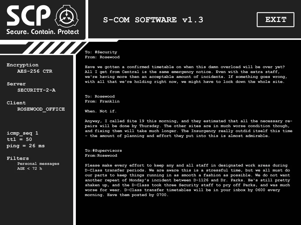 Located in the Head Office. "To: #Security From: Rosewood Have we gotten a confirmed timetable on when this damn overload will be over yet? All I get from Central is the same emergency notice. Even with the extra staff, we're having more then an acceptable amount of incidents. If something goes wrong, with all that we're holding right now, we might have to lock down the whole site.