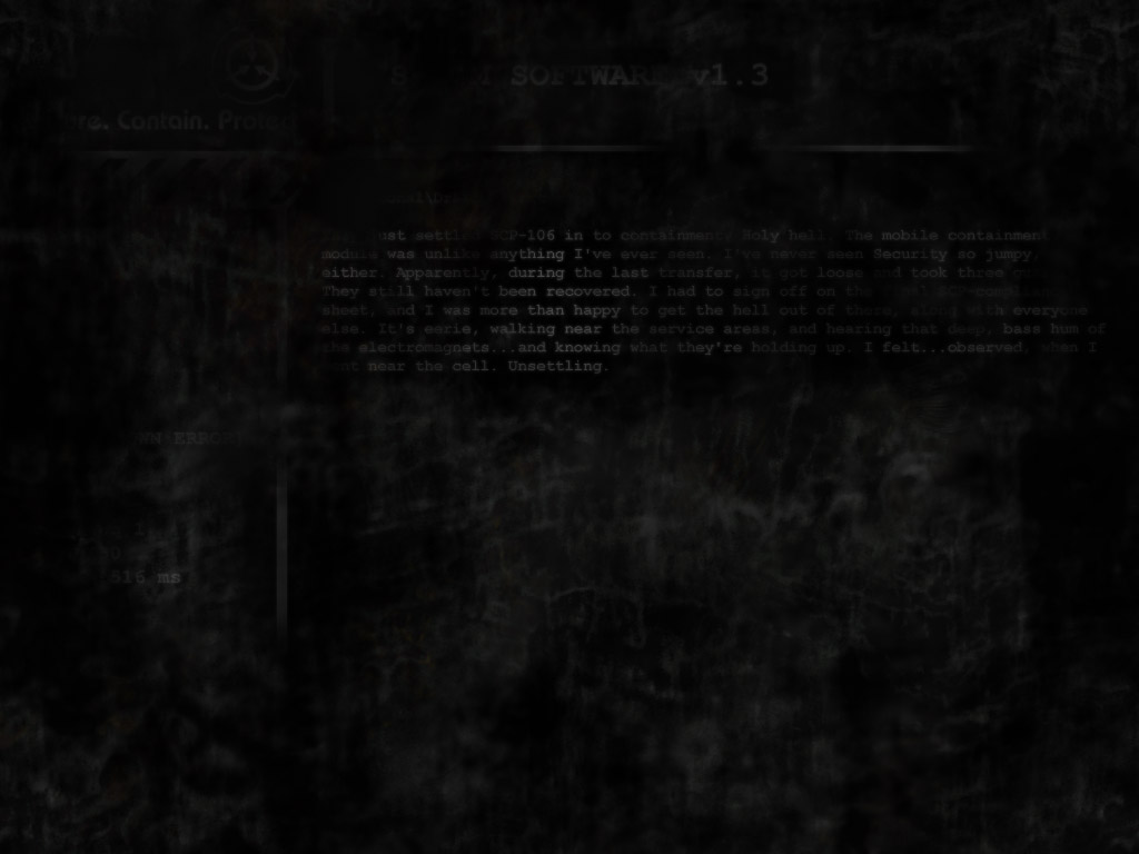 Located in Dr. L.'s Office. "They just settled SCP-106 in to containment. Holy hell. The mobile containment module was unlike anything I've ever seen. I've never seen Security so jumpy, either. Apparently, during the last transfer, it got loose and took three guards. They still haven't been recovered. I had to sign off on the final SCP-compliance sheet, and I was more than happy to get the hell out of there, along with everyone else. It's eerie, walking near the service areas, and hearing that deep, bass hum of the electromagnets...and knowing what they're holding up. I felt...observed, when I went near the cell. Unsettling." |