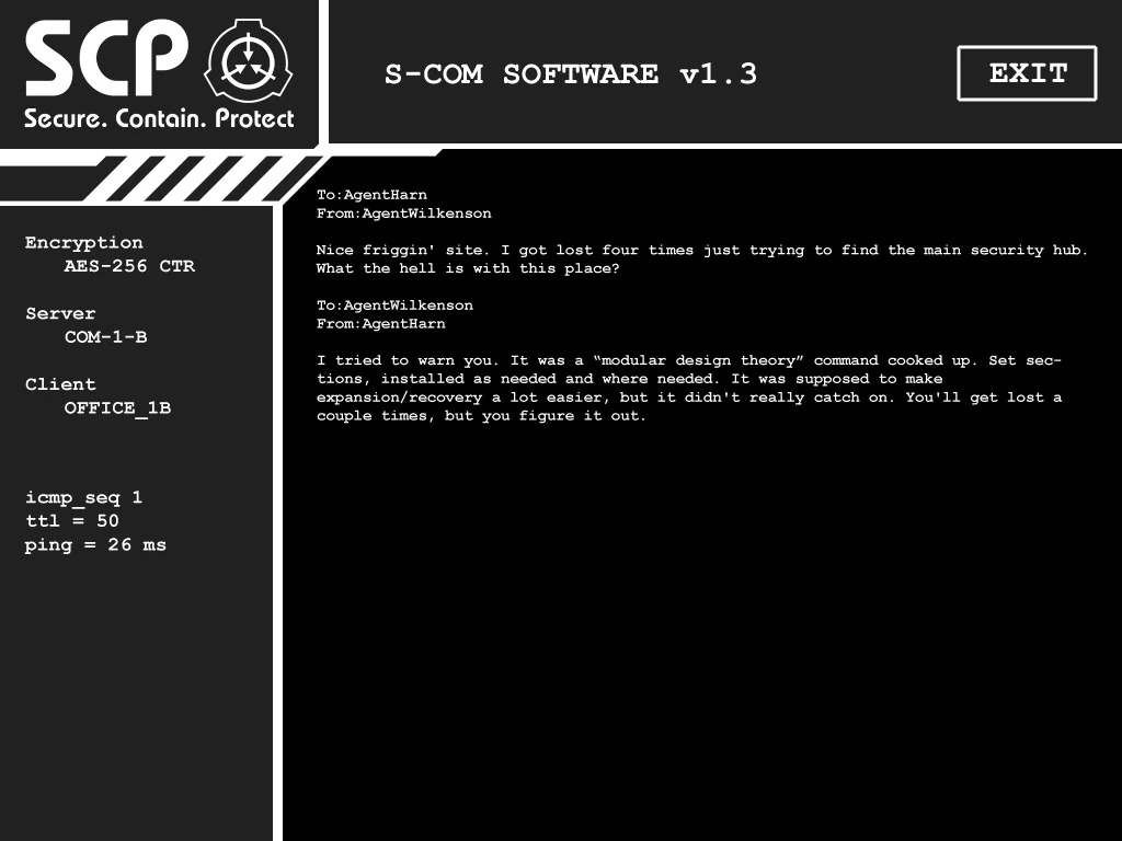 Located in the Basic Office and SCP-1123's Containment Chamber. "To:AgentHarn From:AgentWilkenson Nice friggin' site. I got lost four times just trying to find the main security hub. What the hell is with this place? To:AgentWilkenson From:AgentHarn I tried to warn you. It was a “modular design theory” command cooked up. Set sections, installed as needed and where needed. It was supposed to make expansion/recovery a lot easier, but it didn't really catch on. You'll get lost a couple times, but you figure it out." |