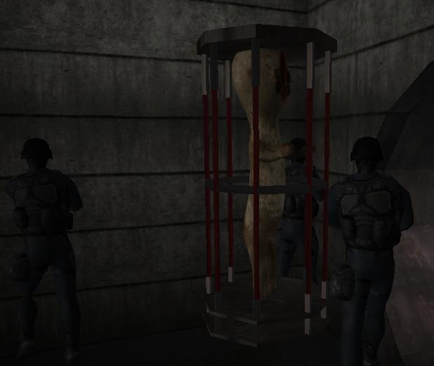 When approaching Gate A, a group of MTFs will be stationed outside. They will focus their sights on SCP-106 attempting to escape the facility if the player has not yet contained it. They will activate the H.I.D. Turret to make SCP-106 retreat, then go back to focusing their attention on the player if they haven't made their escape yet. If the player has contained SCP-106 then several MTF units will walk up to the player and halt them. Three will wait on the bridge, but one additional unit will wait for the player at the stairway if they attempt to bypass the bridge via the tunnel as they would when SCP-106 is escaping.