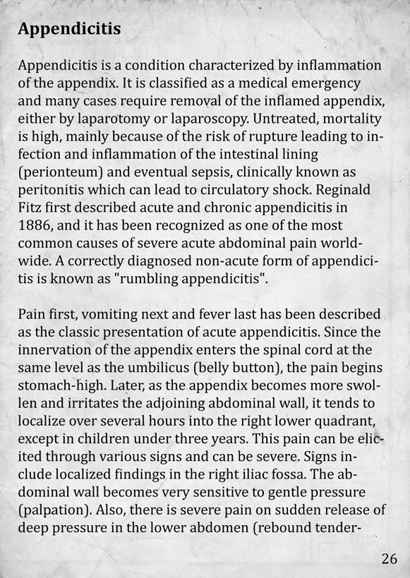 - Appendicitis: Displays the messages "Your stomach is aching" and "The pain in your stomach is getting unbearable" after a prolonged period of time; will significantly lower the rate of stamina regeneration after this happens.