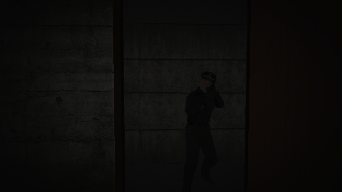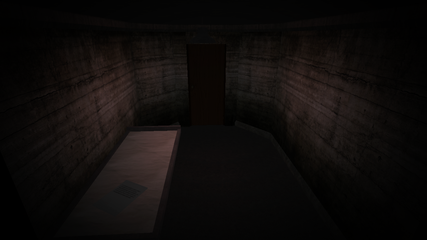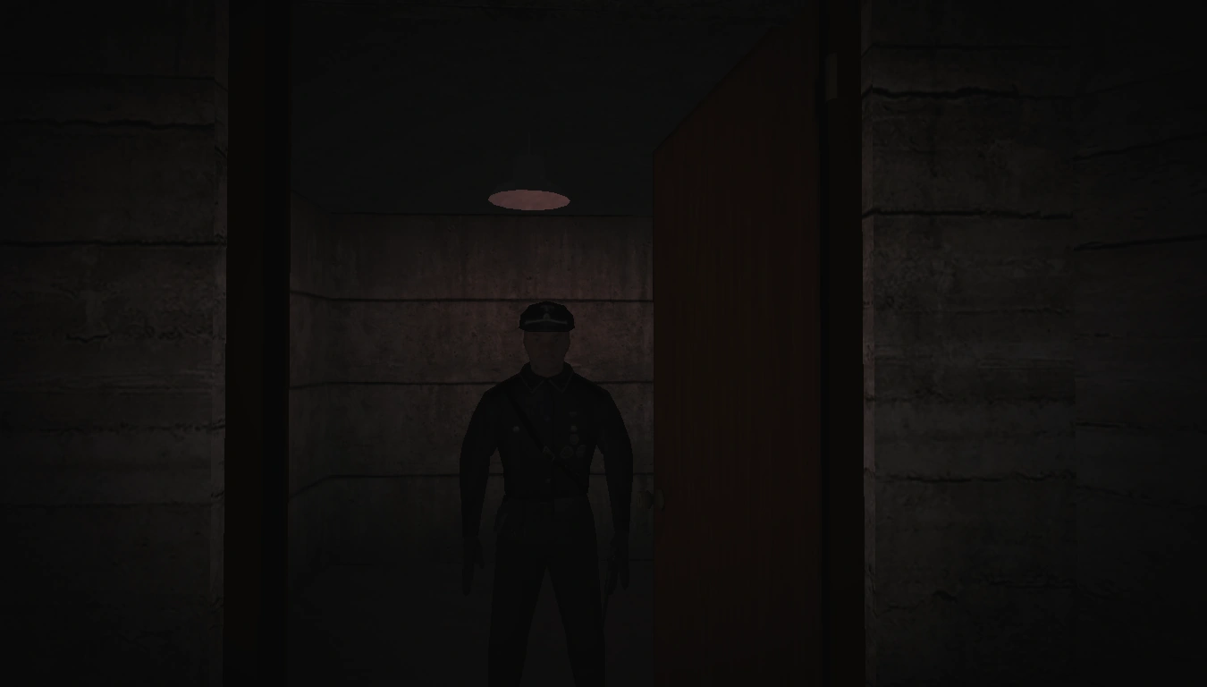 The second scenario is triggered by attempting to leave the chamber, as the door will instead lead the player to a series of hallways, with the same concrete lining the walls. Eventually the player will come across a closed wooden door. Opening it will reveal the officer, who will abruptly turn around and aim his Luger at the player. They will then be taken back to the hallway outside SCP-1123's chamber.